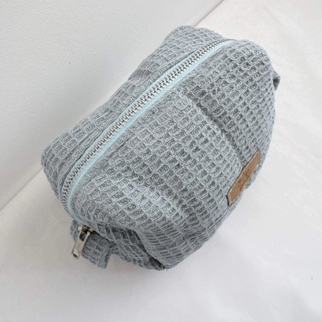Te presentamos el Necessaire Waffle Celeste Pocket, un accesorio versátil, fashionable y súper cómodo. Este neceser está confeccionado con exterior de waffle de algodón y forro de gasa de algodón, garantizando suavidad y estilo.